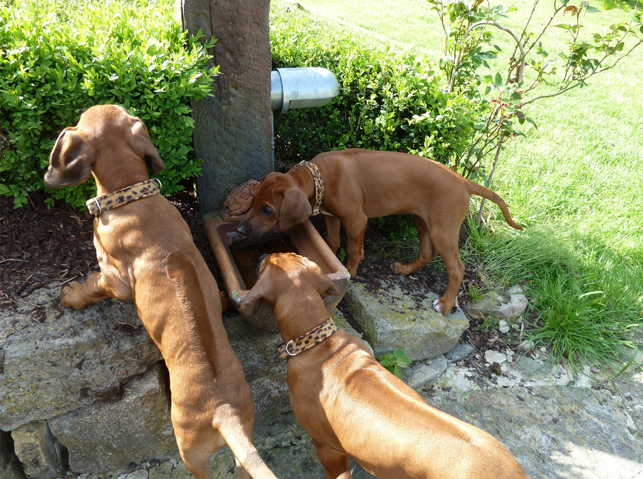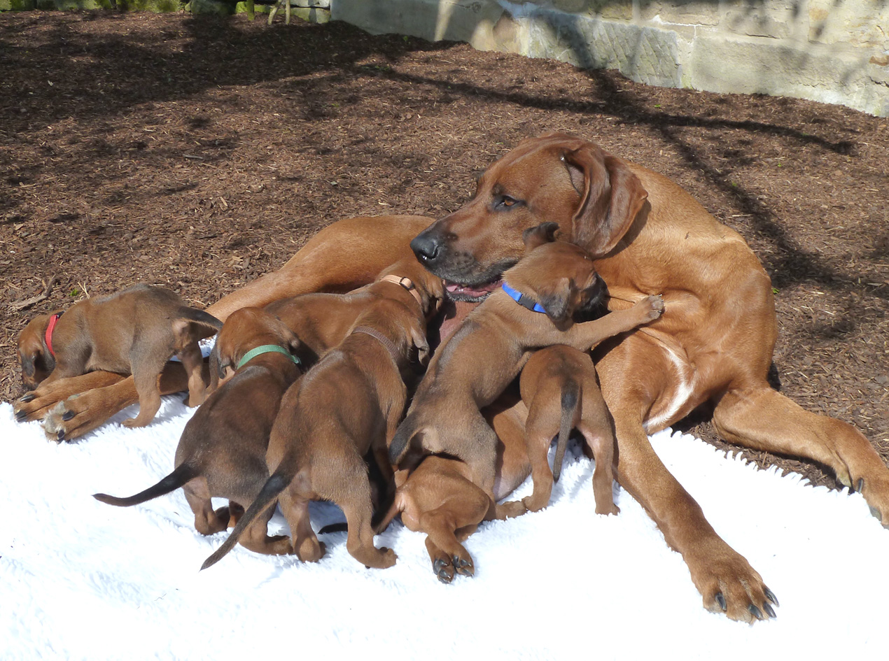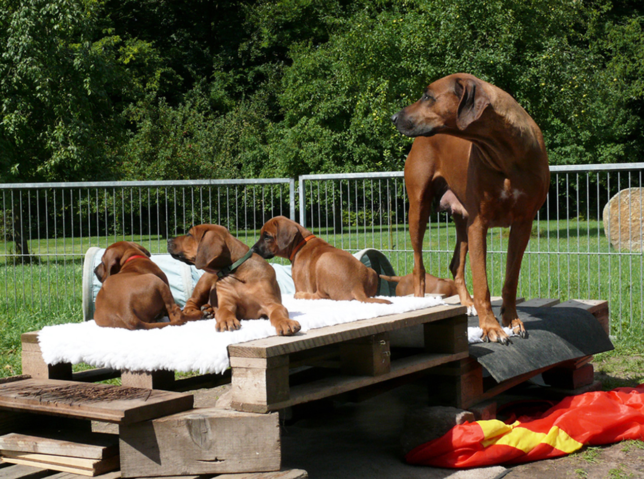 Natürlich werden die Welpen aus unserer Zucht regelmäßig entwurmt sowie vor ihrer Abgabe von einem Tierarzt gründlich untersucht, erhalten eine IHV-Ahnentafel, einen EU-Heimtierausweis, sind geimpft und gechipt. Wenn wir einen Wurf haben, bieten wir unseren Interessenten die Gelegenheit, sich die Zuchtstätte der kleinen Ridgebacks anzusehen. Und selbstverständlich möchten auch wir die möglichen Welpenkäufer kennen lernen. Stellen Sie sich unseren Fragen – zum Wohle ihres späteren Familienmitglieds.