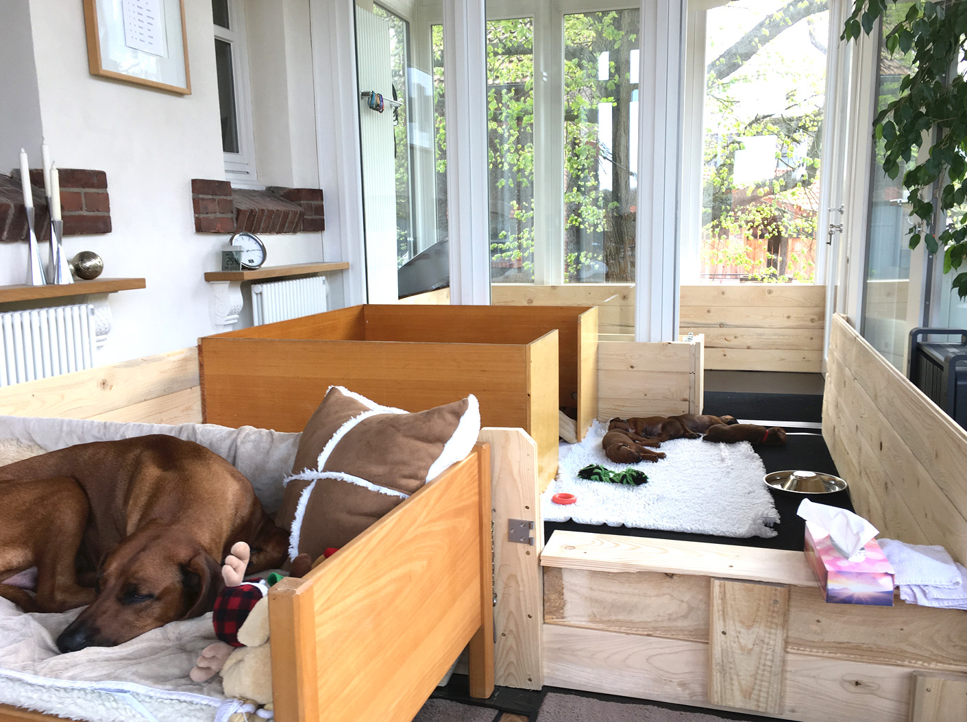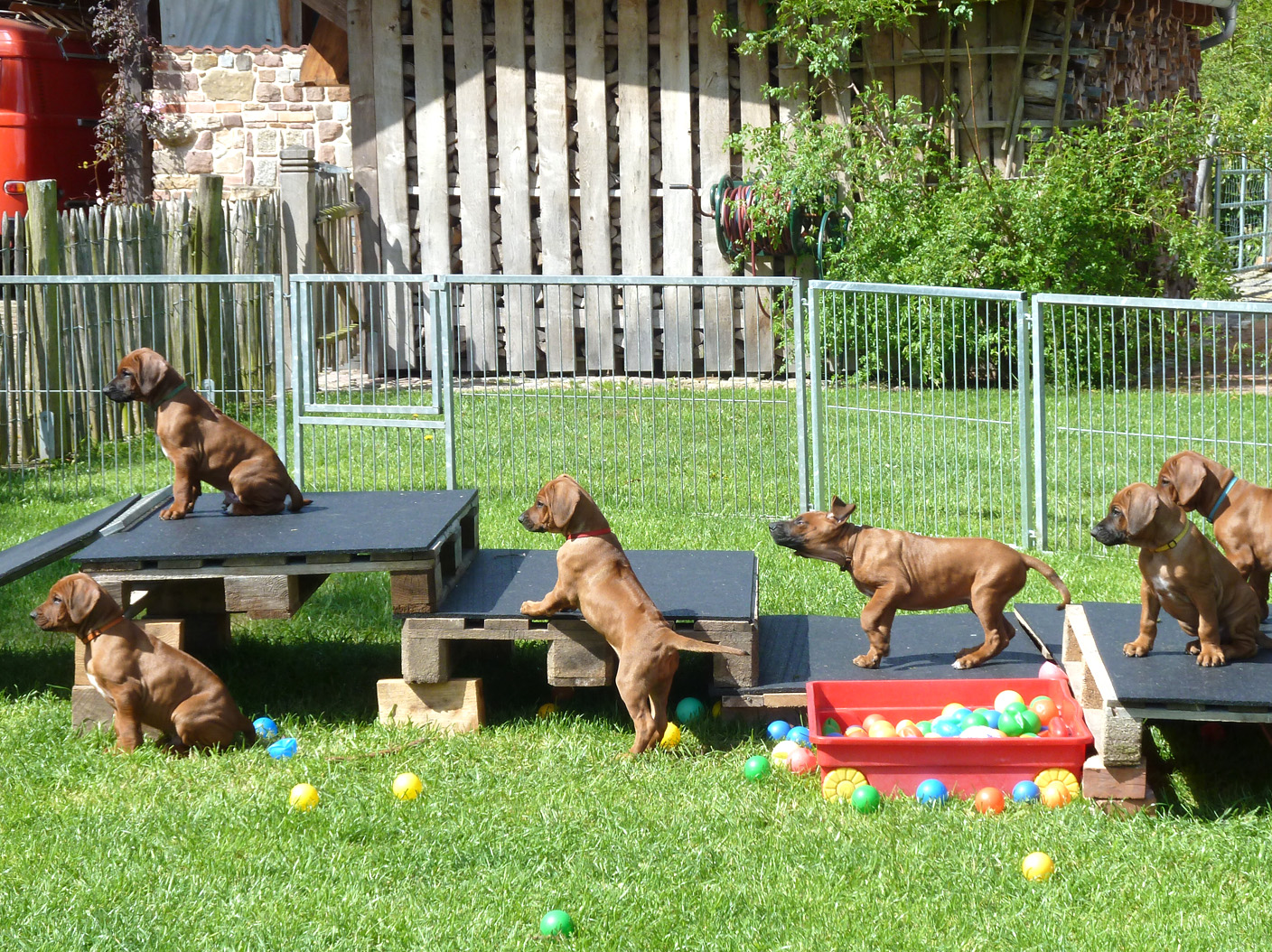 Hundewelpen sind „Nesthocker“. Sie werden taub und blind geboren. Sie sind auf die Versorgung durch ihre Hundemutter angewiesen: sie füttert, säubert und hält ihre Welpen warm. In ihren ersten Lebenstagen orientieren sich die Neugeborenen ausschließlich über ihren Tast- und Geruchssinn – ihre Hauptbeschäftigung ist Trinken und Schlafen. Um den 10. Tag herum beginnen sich die Augen zu öffnen, nach und nach entwickelt sich nun auch ihr Gehör. Die ersten Gehversuche starten dann ungefähr Ende der zweiten Lebenswoche, verschiedene Lautäußerungen wie Bellen, Knurren und Heulen kommen hinzu und der Spieltrieb setzt ein, die Neugier wächst ebenso wie die Abenteuerlust. Der Bewegungsradius der Welpen vergrößert sich nun von Tag zu Tag, von Woche zu Woche. Eine intensive Prägezeit der Welpen ist für uns eine Selbstverständlichkeit. Unsere Welpen werden groß inmitten unseres Alltags zwischen all den anderen Familienmitgliedern. Sie dürfen viele frische Witterungen aufnehmen, bekommen immer wieder neue Eindrücke präsentiert und machen positive Erfahrungen in der Welt der Menschen, um zukünftig zu gesellschaftsfähigen Begleitern werden zu können. Daher ist auch ein enger Kontakt zu uns Menschen für die optimale Entwicklung der kleinen Racker von großer Wichtigkeit. Ebenso fördert der frühe Aufbau einer liebevollen menschlichen Beziehung, natürlich gemeinsam mit einer fürsorglichen und gerechten Hundemutter, die Fähigkeit, künftig über mentale Ausgeglichenheit und ein gesundes Selbstbewusstsein zu verfügen. In der kurzen Zeit, die die Welpen mit uns verbringen, möchten wir die Grundlage dafür schaffen und sie zudem bestmöglich auf ihr neues Leben als Familienhund vorbereiten. Aus diesem Grund wachsen die Welpen bei uns im Haus auf. Im unserem Wintergarten ist deren „Kinderstube” eingerichtet. Ein zum Abenteuerspielplatz umfunktionierter Garten bietet genug, um sich mit der Welt da draußen anzufreunden und ein stabiles Wesen zu entwickeln.
