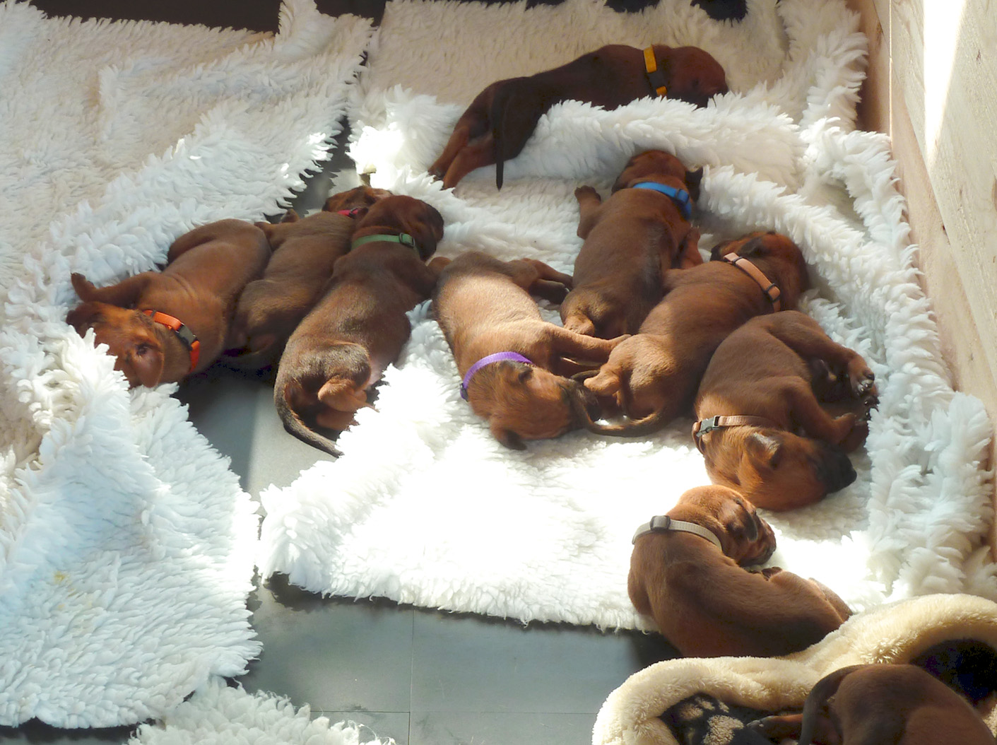 Hundewelpen sind „Nesthocker“. Sie werden taub und blind geboren. Sie sind auf die Versorgung durch ihre Hundemutter angewiesen: sie füttert, säubert und hält ihre Welpen warm. In ihren ersten Lebenstagen orientieren sich die Neugeborenen ausschließlich über ihren Tast- und Geruchssinn – ihre Hauptbeschäftigung ist Trinken und Schlafen. Um den 10. Tag herum beginnen sich die Augen zu öffnen, nach und nach entwickelt sich nun auch ihr Gehör. Die ersten Gehversuche starten dann ungefähr Ende der zweiten Lebenswoche, verschiedene Lautäußerungen wie Bellen, Knurren und Heulen kommen hinzu und der Spieltrieb setzt ein, die Neugier wächst ebenso wie die Abenteuerlust. Der Bewegungsradius der Welpen vergrößert sich nun von Tag zu Tag, von Woche zu Woche. Eine intensive Prägezeit der Welpen ist für uns eine Selbstverständlichkeit. Unsere Welpen werden groß inmitten unseres Alltags zwischen all den anderen Familienmitgliedern. Sie dürfen viele frische Witterungen aufnehmen, bekommen immer wieder neue Eindrücke präsentiert und machen positive Erfahrungen in der Welt der Menschen, um zukünftig zu gesellschaftsfähigen Begleitern werden zu können. Daher ist auch ein enger Kontakt zu uns Menschen für die optimale Entwicklung der kleinen Racker von großer Wichtigkeit. Ebenso fördert der frühe Aufbau einer liebevollen menschlichen Beziehung, natürlich gemeinsam mit einer fürsorglichen und gerechten Hundemutter, die Fähigkeit, künftig über mentale Ausgeglichenheit und ein gesundes Selbstbewusstsein zu verfügen. In der kurzen Zeit, die die Welpen mit uns verbringen, möchten wir die Grundlage dafür schaffen und sie zudem bestmöglich auf ihr neues Leben als Familienhund vorbereiten. Aus diesem Grund wachsen die Welpen bei uns im Haus auf. Im unserem Wintergarten ist deren „Kinderstube” eingerichtet. Ein zum Abenteuerspielplatz umfunktionierter Garten bietet genug, um sich mit der Welt da draußen anzufreunden und ein stabiles Wesen zu entwickeln.